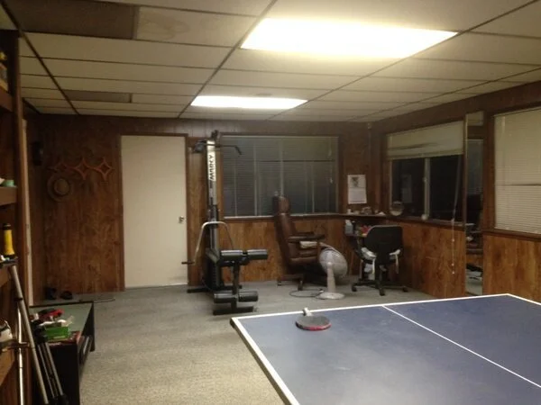 Through the patio doors from the family room, there is an addition which we'll call the Rec Room. Can we say Brady Brunch? That wood paneling is awful and 100% dates the space, so painting them out is an absolute must. Also, you can see that the acoustical ceilings show signs of old roof leaks which we'll need to have painted out. The industrial carpet is original and dirty so we'll explore replacing it. The blinds are dusty but work and serves a purpose so we'll get them ultrasonically cleaned when we have all the windows cleaned. The acrylic light diffusers are yellowed from age and will need to be replaced. Oh, did I mention that this addition takes up the majority of the backyard? There's not much yard left so we've gotta sell this space like nobody's business!