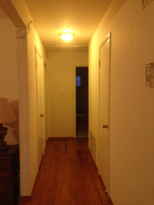 Moving down the hallway, you can see a web of cable wire that is strung throughout the house. Apparently they haven't upgraded to a wireless router and since they're moving, no use in making the change now, but we'll need to remove all that cable when we paint. There are two light fixtures in the hall that needs to be replaced. Those brass boob lights have got to go! Oh, and we'll be addressing all the mismatched door knobs throughout the house. It's bizarre...they're all a different style and color!