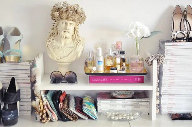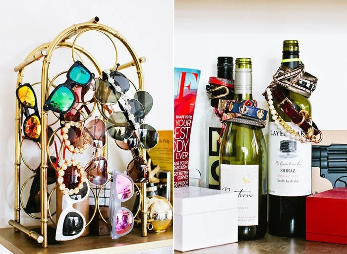 And finally, you've got to inject your personality into this space. It should ooze "you...to da max!" This can be achieved with personal photos, beautiful drapes, and chic rugs, but the real stars are of course, all your clothes, shoes, purses and accessories. A great way to show off your personality is the way you merchandise your accessories. There are no rules here...anything can be used from wine racks, wine bottles, pretty dishes, and hooks are good options. This where your creativity comes into play. Here are some examples for inspiration.