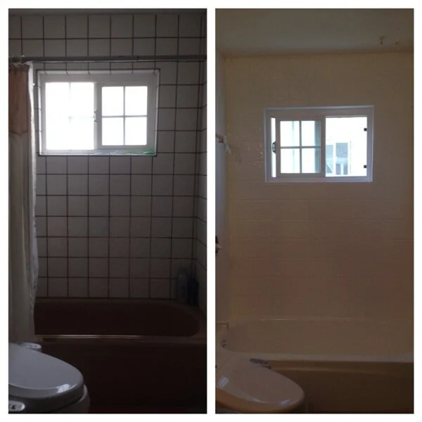 DAY 5: This is something new that I tried - reglazing the tub, tile and vanity countertop. I've seen pictures but I had not seen it in person and until I did, I couldn't take the leap. To stay on budget, we couldn't afford to gut the entire bathroom as originally planned. It's not just about purchasing the new tub, and the new tub wall surround, but it also includes the labor to remove it and put it back together. I've never gotten so many bids ever! I also received conflicting information. One contractor told me we couldn't replace the fixtures without removing the tile and then I had other opinions that said I could. In the end, I found a replacement trim kit that allows me to change the fixtures without having to touch the valves (the plumbing guts inside the wall). Pheww!! Take a look at this...I was amazed and would recommend if you're on a tight budget! It looks so clean.