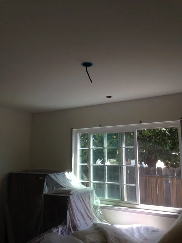 DAY 2 - ceilings are painted throughout and the electrician centered the light fixture in the front bedroom.